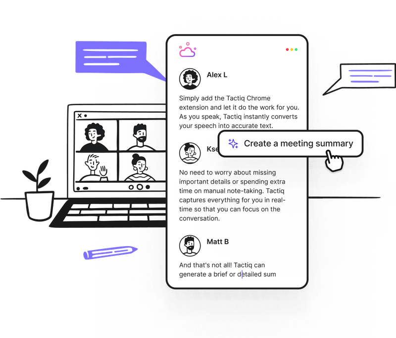 Taactiq 捕获讨论的所有内容,让您能够专注于对话而不是做笔记。自动笔记可确保不会遗漏任何重要细节,从而降低人为错误的风险,并在会议结束后立即提供给所有参与者,让每个人都了解情况。它可轻松与 Google Meet 集成,通过 Google Workspace 应用提供实时更新和集中访问。