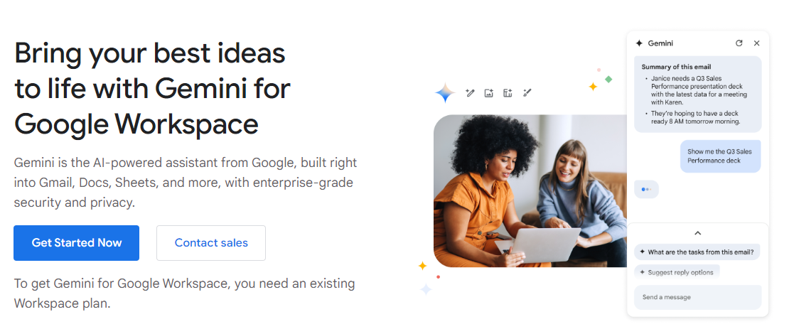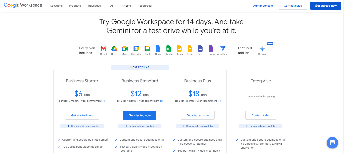 每个计划都提供了促进协作和提高工作效率的全面工具,包括 Gmail、Google 云端硬盘、Google 日历、Google Chat、Google 文档、Google 表格和其他 Google Workspace 应用。 Gemini 是这些计划的一个值得注意的附加组件,包括翻译字幕和笔记等功能。