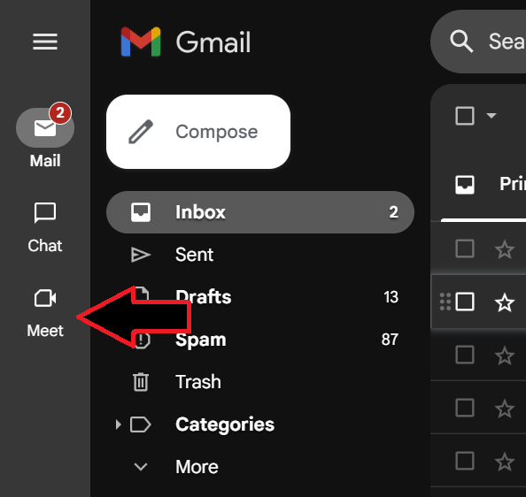 - 在 Gmail 中,在侧边栏中找到“会议”部分。