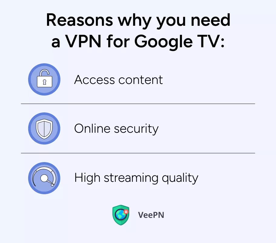 出于三个合理的原因,为什么在 Google TV 上使用虚拟专用网络 (VPN)(例如 VeePN)是个好主意。由于 Google TV 的 VPN 应用程序通过安全“隧道”将您连接到远程服务器,因此您将获得以下好处: