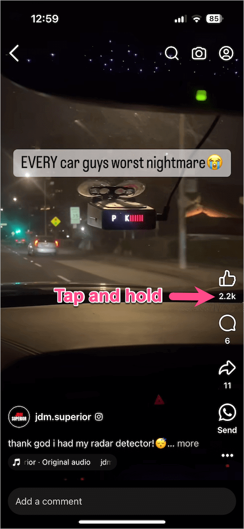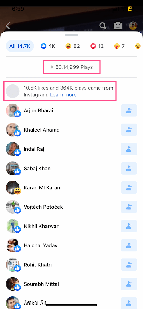 要查看其他人的卷轴的观看量,请在 Facebook 应用程序中打开所需的卷轴。现在点击并按住(长按)数字就在“赞”按钮(竖起大拇指图标)下方可见。