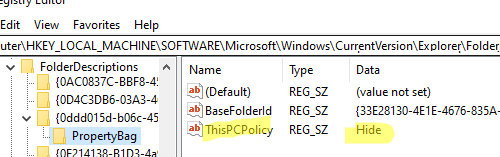 Action: Update Hive: HKEY_LOCAL_MACHINE Key Path: SOFTWAREMicrosoftWindowsCurrentVersionExplorerFolderDescriptions{0ddd015d-b06c-45d5-8c4c-f59713854639}PropertyBag Value name: ThisPCPolicy Value type: REG_SZ Value date: Hide了解如何使用组策略创建或更改注册表值。