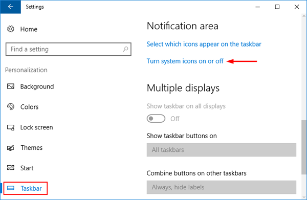 - 将打开“设置”应用程序的相应页面。单击“打开或关闭系统图标” 链接在右侧。