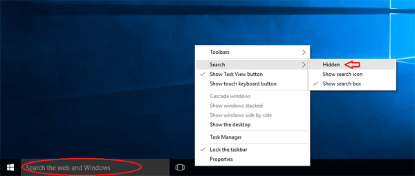 - 单击隐藏。搜索按钮将立即从任务栏消失
