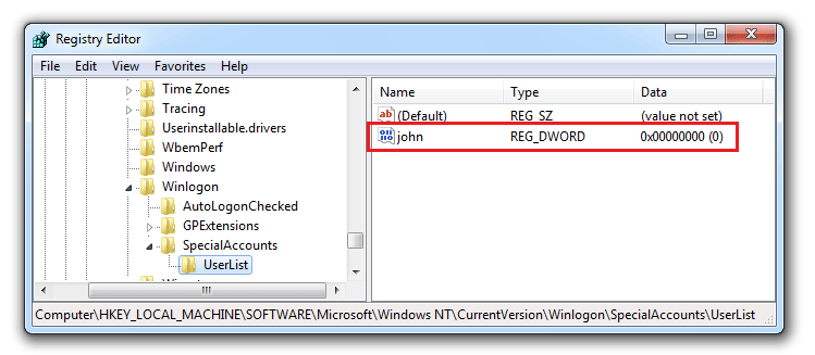 HKEY_LOCAL_MACHINE\Software\Microsoft\Windows NT\CurrentVersion\Winlogon\SpecialAccounts\Userlist