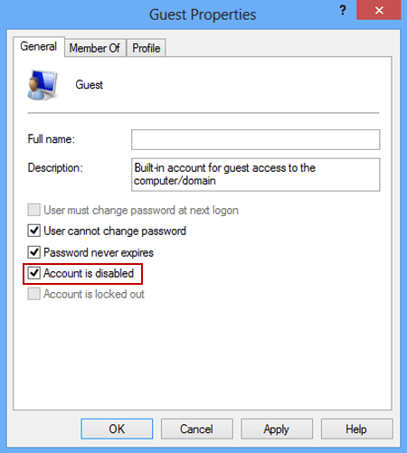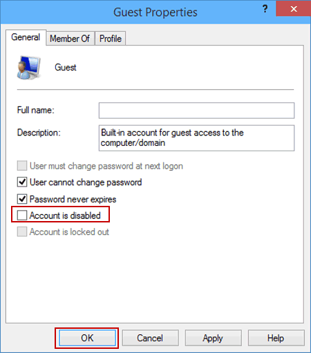步骤3:取消选择帐户已被禁用然后单击好的在“来宾属性”对话框中启用它。