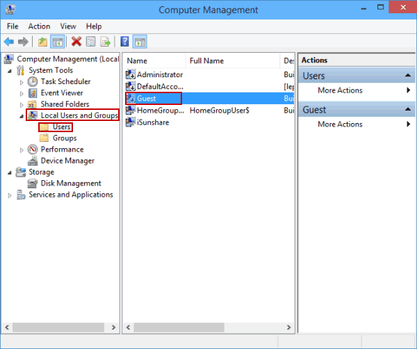 方式二:在计算机管理中启用Guest帐户