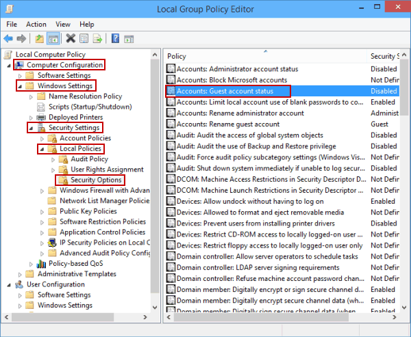 方法 2:在本地组策略编辑器中禁用来宾帐户。