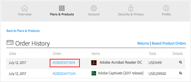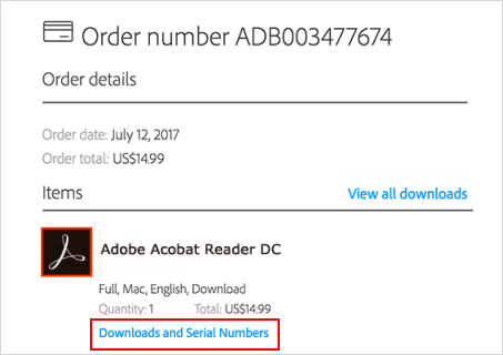 方式 1:在订单历史记录中查找 Acrobat DC 序列号