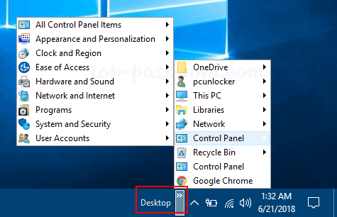 桌面工具栏将出现在任务栏中的系统托盘旁边。单击桌面工具栏右侧的两个小箭头>>,您可以在一个长列表中查看桌面上的所有项目。