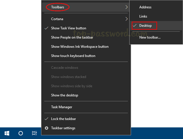 右键单击任务栏上的空白区域,然后导航到工具栏并取消选中桌面选项。这将立即从 Windows 任务栏中删除桌面工具栏。
