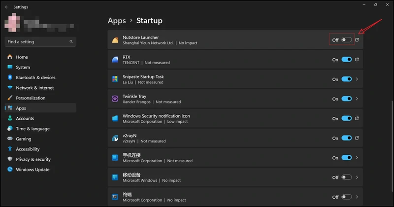 按“开始”+i 打开“Windows 设置”,然后导航至“应用程序”>“启动”。