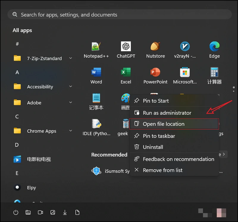 1. 打开开始菜单,右键单击要自动启动的程序,选择打开文件位置。