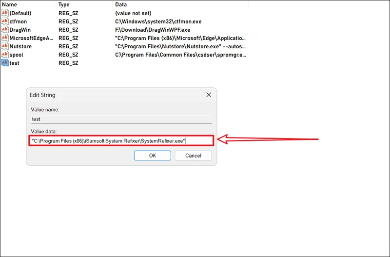 步骤4双击新创建的字符串值并输入软件的完整路径.exe文件值数据字段中。