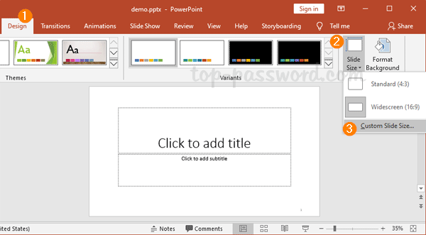 - 选择设计功能区上的选项卡。单击“幻灯片尺寸” 按钮,然后选择“自定义幻灯片尺寸” 从下拉菜单中。