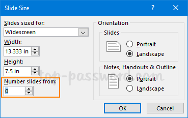 - 将打开“幻灯片大小”对话框。您可以更改“幻灯片编号来自”框从 1 到不同的数字。