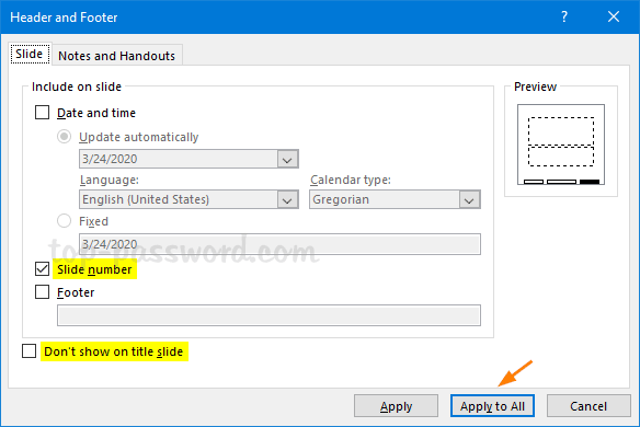 - 将出现“页眉和页脚”对话框。在“幻灯片”选项卡中,选中“幻灯片编号“。如果您想禁用标题幻灯片上的幻灯片编号,请选中该框“不显示在标题幻灯片上”。