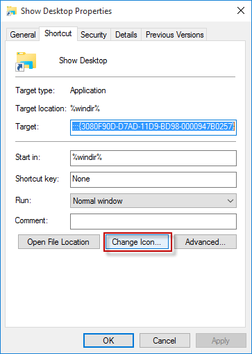 右键单击创建的快捷方式并选择特性。上捷径选项卡,单击更改图标按钮。您可以从以下文件中选择一个图标: