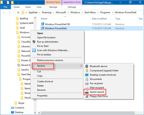 要从“发送到”上下文菜单中删除“快速启动”,只需删除快速启动快捷方式从发送至文件夹。
