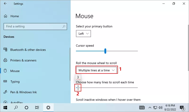 注:默认鼠标滚动速度 Windows 10/11一次 3 行,我们在下面的示例中将速度设置为此值。当然,您可以将鼠标滚动速度设置为最舒适的值。