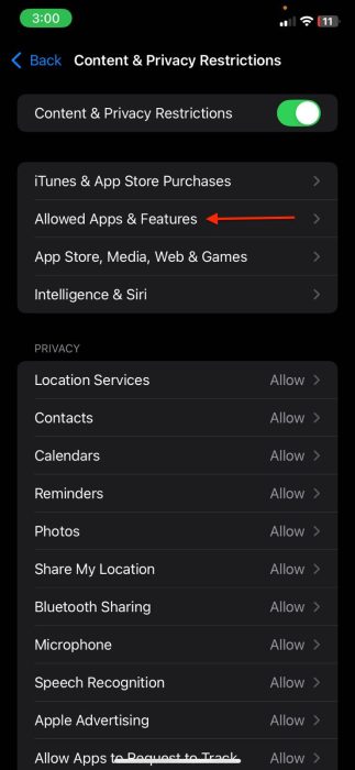 - 单击内容和隐私限制并选择允许的应用程序和功能。