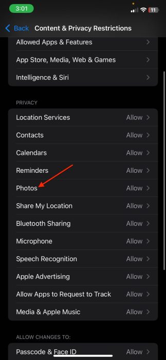- 另外,滚动到照片选项并选择允许更改。