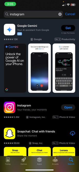 - 单击搜索右下角的图标并输入Instagram。