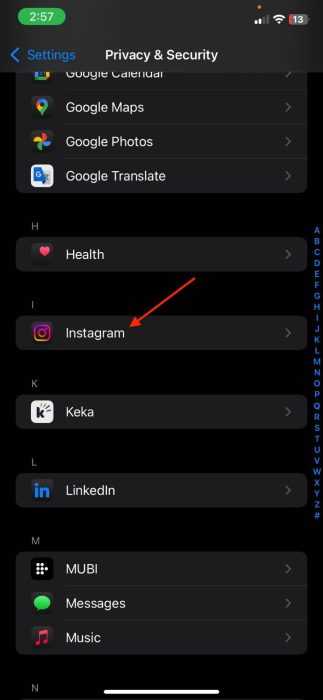如果相机访问问题特定于 Instagram 应用程序,最简单的解决方案是更改 iPhone 的隐私和安全设置。这些设置控制哪些应用程序可以访问相机,如果您在安装后不小心没有授予 Instagram 相机权限,您可以在此处执行此操作。具体方法如下: