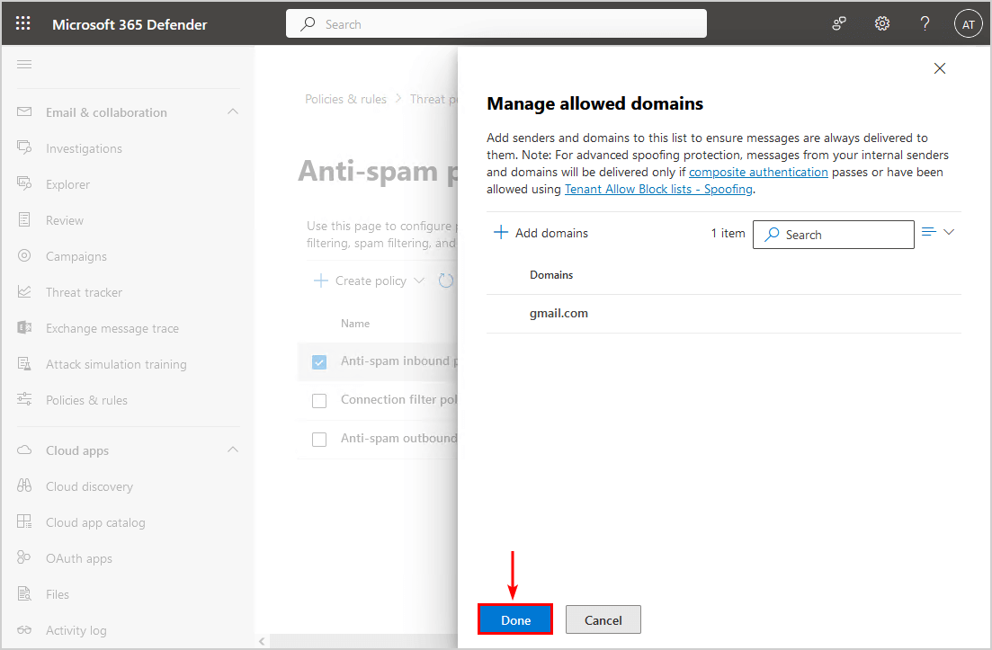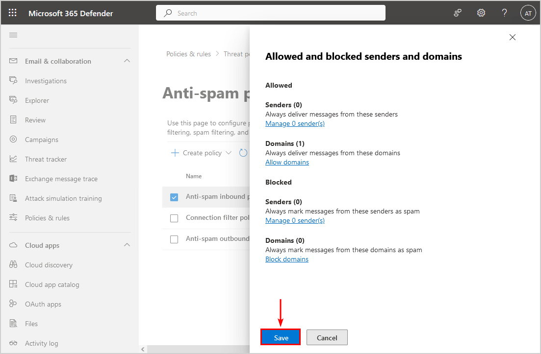 该域已添加到 Microsoft 365 反垃圾邮件入站策略允许的域列表中。从现在开始,具有该域的所有电子邮件都将绕过垃圾邮件过滤,并且不会被标记为垃圾邮件。