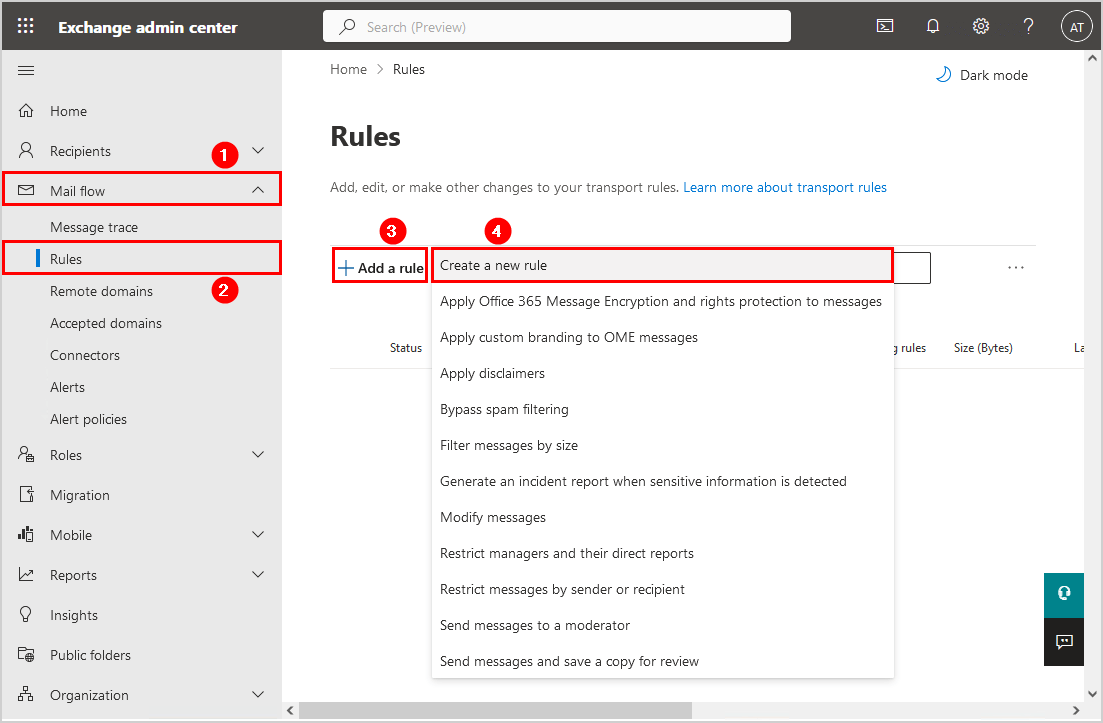 笔记:您不能使用邮件标头和邮件流规则将内部发件人指定为安全发件人。本节中的过程适用于外部发件人仅有的。