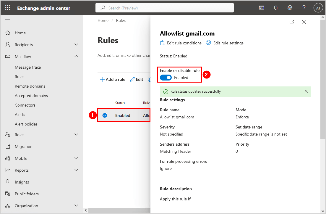 您了解了如何将 Microsoft 365 中的域列入白名单以绕过垃圾邮件过滤。建议创建邮件流规则并配置条件以跳过垃圾邮件过滤。从现在起,发件人域将不会在 Exchange Online Protection (EOP) 中被标记为垃圾邮件。