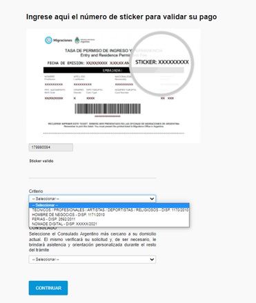 确认数据后,您将通过输入付款凭证上显示的贴纸编号来验证付款。根据所请求的入境授权类型,您必须注册申请人的姓名或教育机构发送的注册号。最后,您将选择验证领事馆。