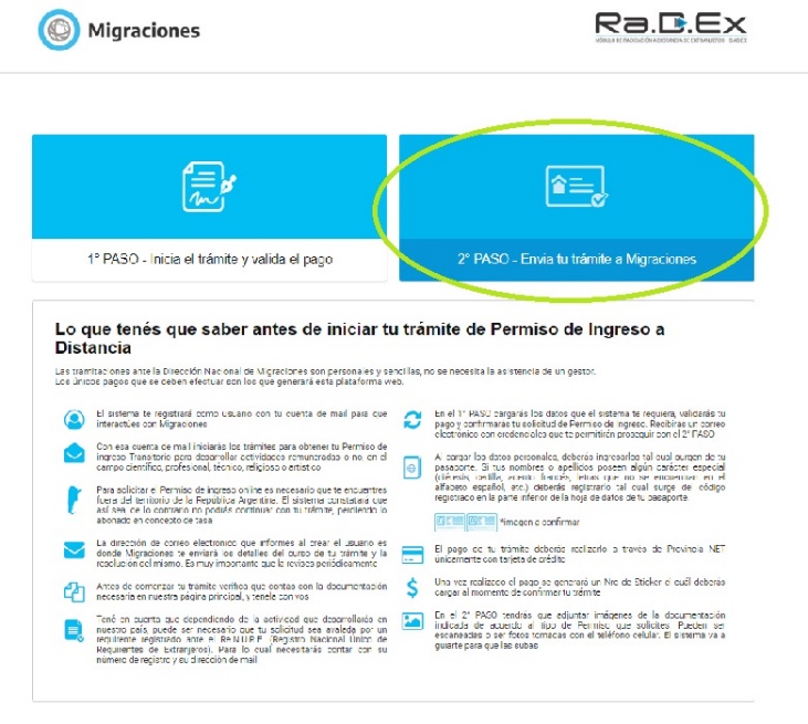 系统将提示您登录。如果您在 RADEX 系统上还没有帐户,请使用“REGISTRAR USUARIO DE INICIO DE TRAMITE”创建一个帐户。之后,您将看到主屏幕,其中有 4 个选项: