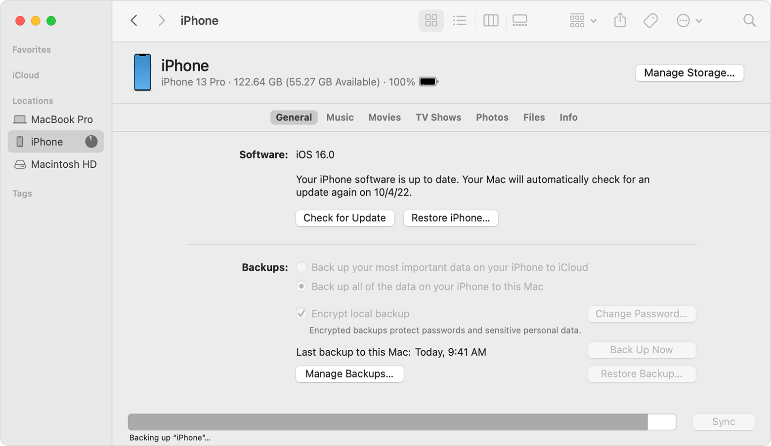 2. 将您的 Apple 设备备份到 Mac 上的 Finder