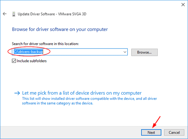 - 点击浏览找到您之前备份的驱动程序文件的位置,然后单击下一个。确保“包括子文件夹” 选项被选中。
