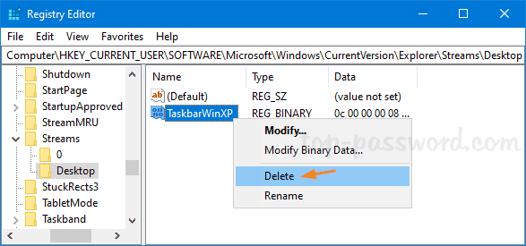在右侧窗格中,右键单击名为的二进制值任务栏WinXP并选择删除。重新启动文件资源管理器,任务栏工具栏将恢复为系统默认设置。