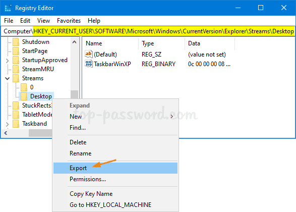 打开注册表编辑器并浏览到注册表项:HKEY_CURRENT_USER\Software\Microsoft\Windows\CurrentVersion\Explorer\Streams\Desktop。右键单击桌面键入左侧并选择出口。