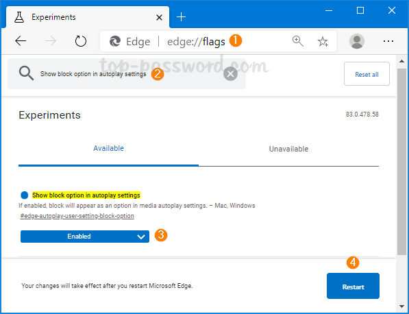 接下来,搜索“在自动播放设置中显示阻止选项”并选择“启用” 选项从标志旁边的下拉菜单中。单击重新启动按钮重新启动 Microsoft Edge。