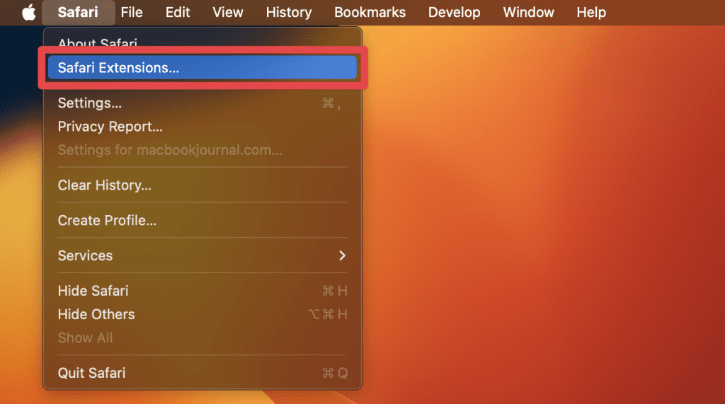 - 点击狩猎之旅在菜单栏中并选择Safari 扩展。这将打开应用程序商店。