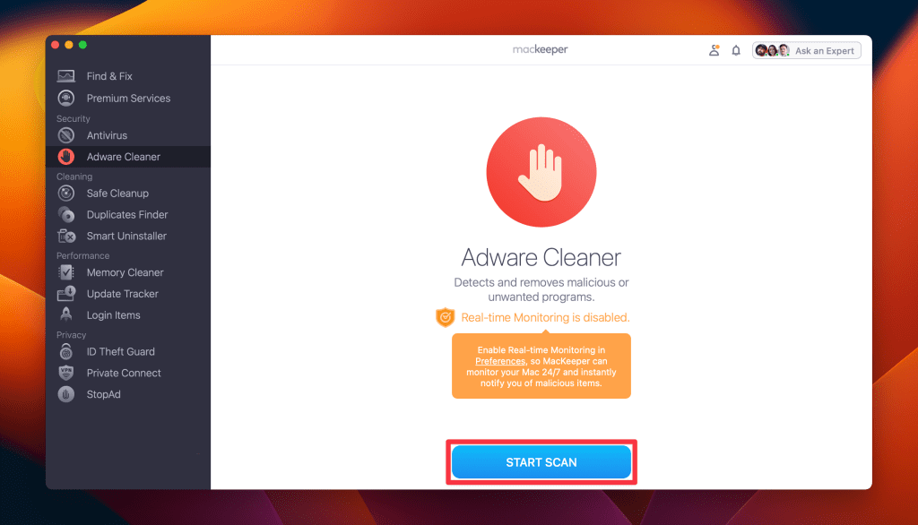 - 打开 MacKeeper 并单击广告软件清理器在左侧边栏中。