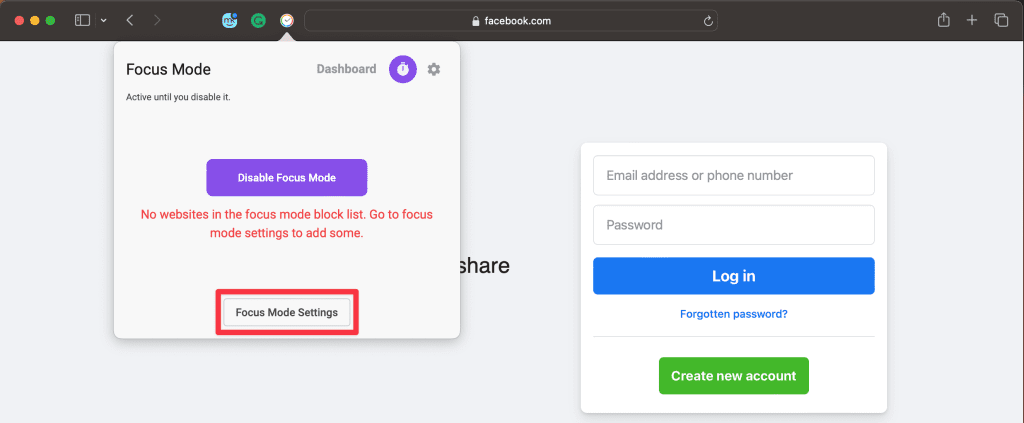 - 要阻止站点,请单击扩展程序图标,然后选择对焦模式设置。