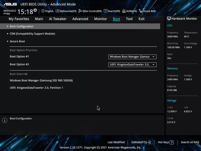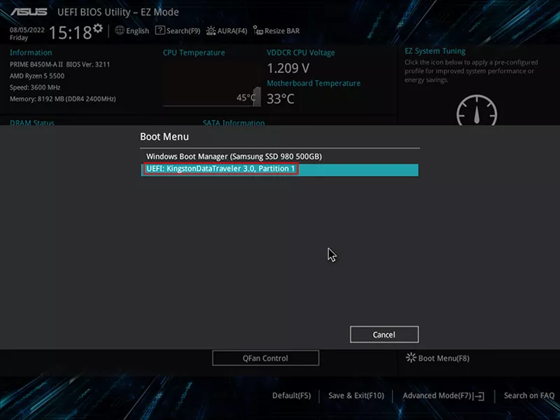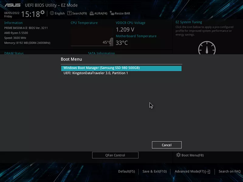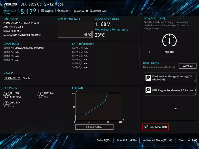 步骤 1:启动计算机并立即按住 BIOS 键(删除/F2)直到进入UEFI BIOS 实用程序。一般大部分主板都会显示EZ模式,然后点击启动菜单或按F8打开启动菜单,如下图所示。