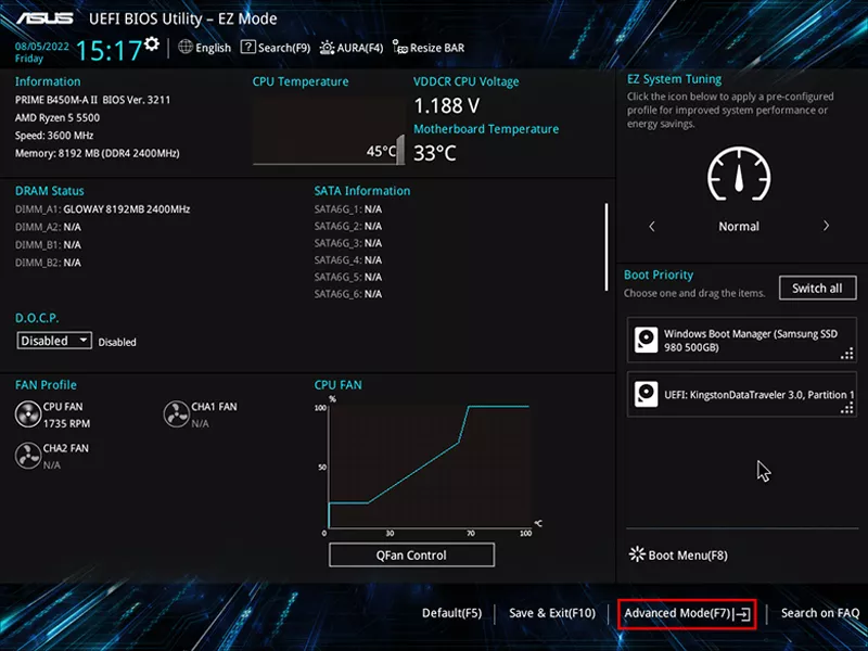 步骤1:在EZ模式界面,点击高级模式或按F7打开高级模式。