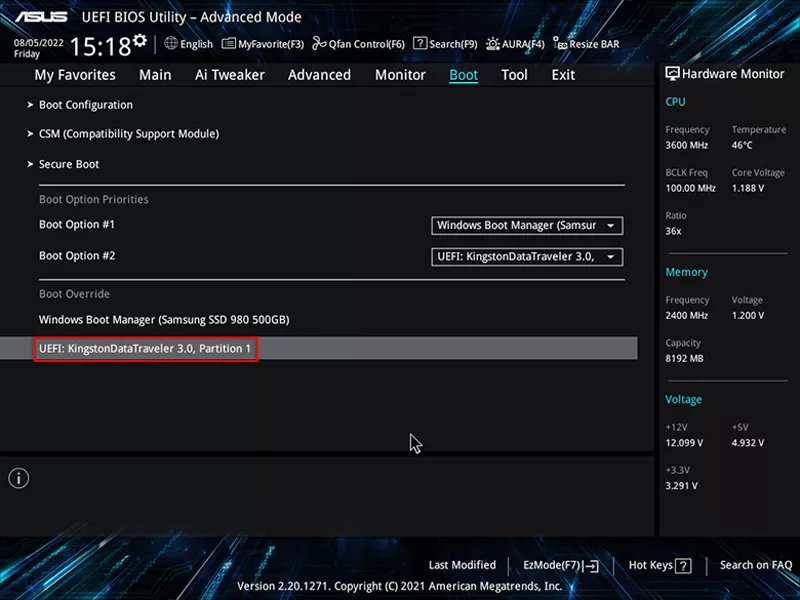 方式 2:使用 UEFI BIOS 实用程序将计算机设置为从 USB 驱动器启动。