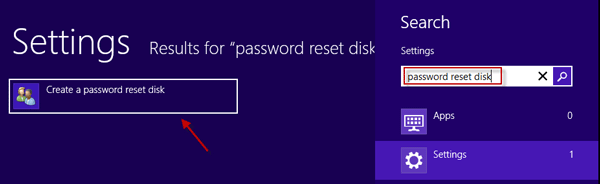 在 Windows 8/8.1 中:将鼠标点移动到屏幕右上角,然后单击搜索。在搜索框中输入“密码重置盘”,然后您可以看到“创建密码重置盘”出现。