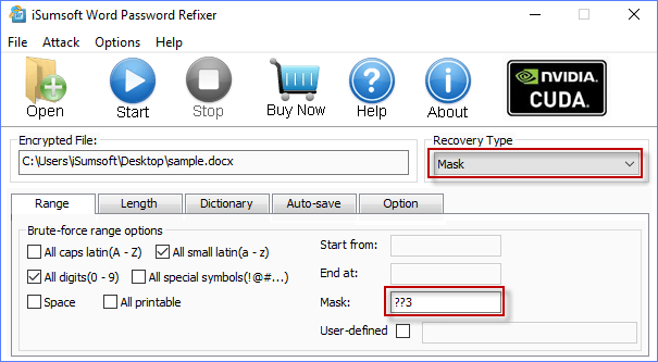 提示:如何选择恢复类型取决于您对密码的了解或记住程度。简单来说,你需要告诉程序尽可能多的信息,包括密码范围、长度等,这样它才能帮助你更快地找到密码。例如,我记得我的密码包含三个字符,最后一个字符是3,所以我选择Mask,并将Mask设置为??3,如下图所示。