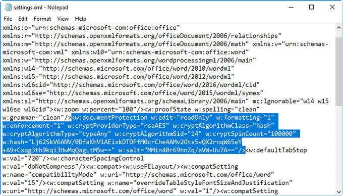 第五步:用“记事本”打开“settings.xml”文件,然后找到文件保护标记并删除整个元素,包括和>括号。