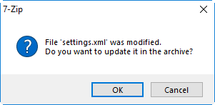 步骤6:保存修改后的“settings.xml”并关闭。当提示您更新存档中的此更改时,单击“确定”。