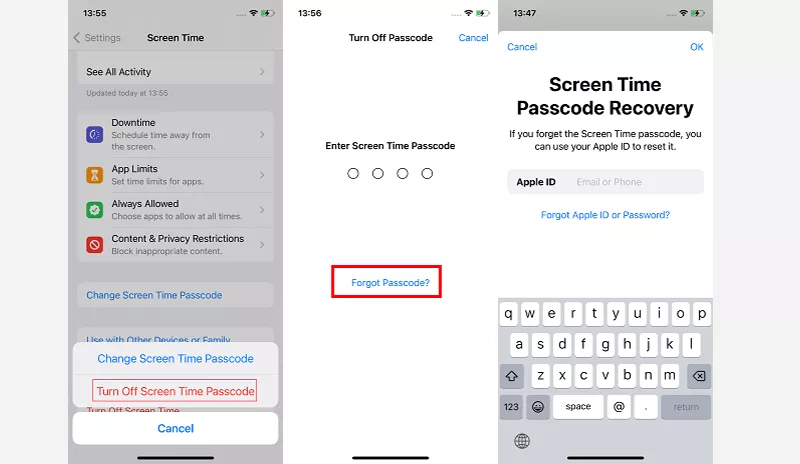 步骤2:轻敲关闭屏幕时间密码>忘记密码,然后输入您的