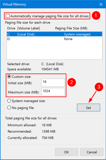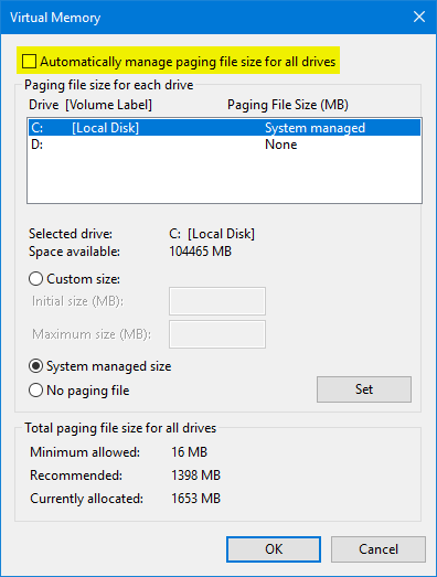 - 现在您将看到虚拟内存设置,如下所示。默认情况下,自动管理所有驱动器的分页文件大小框被选中。如果您想为每个驱动器单独配置页面文件,则需要取消选中此框。